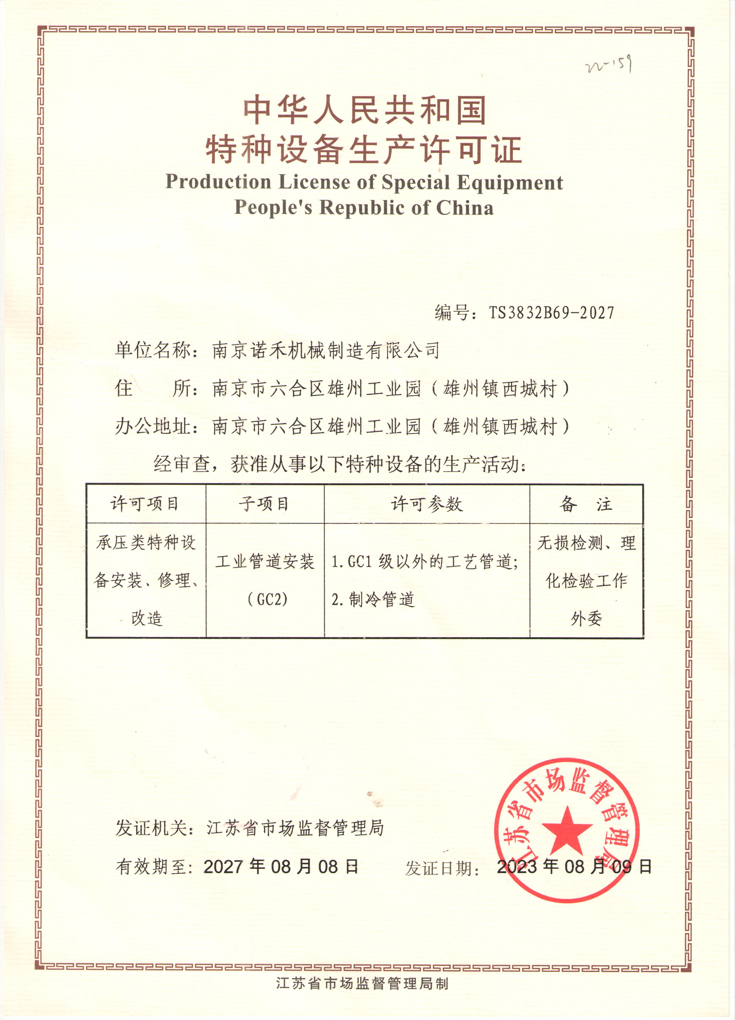 公司取得GC2工業(yè)管道安裝資質(zhì); 證書編號:TS3832869-2027